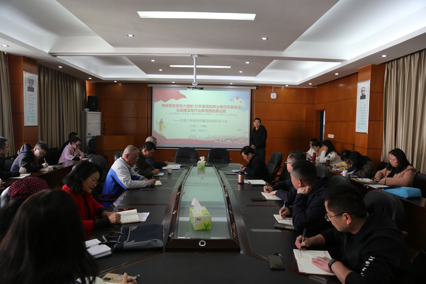 3月8日下午,学院党委组织学院全体教工党员开展专题集中学习。本次专题集中学习邀请院党委副书记、院长丁建军领学湘西州第十二次党代会报告。本次专题集中学习会由院党委书记李启贵主持。