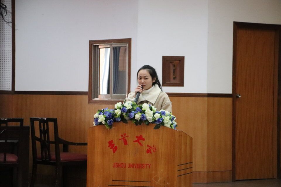 用人单位代表酒鬼酒股份有限公司杨娅林女士发言。她首先对学院的邀请表示感谢,随后介绍了酒鬼酒公司相关情况和发展前景,并积极地向大家推荐其公司,希望更多的有志青年能到公司一展身手。