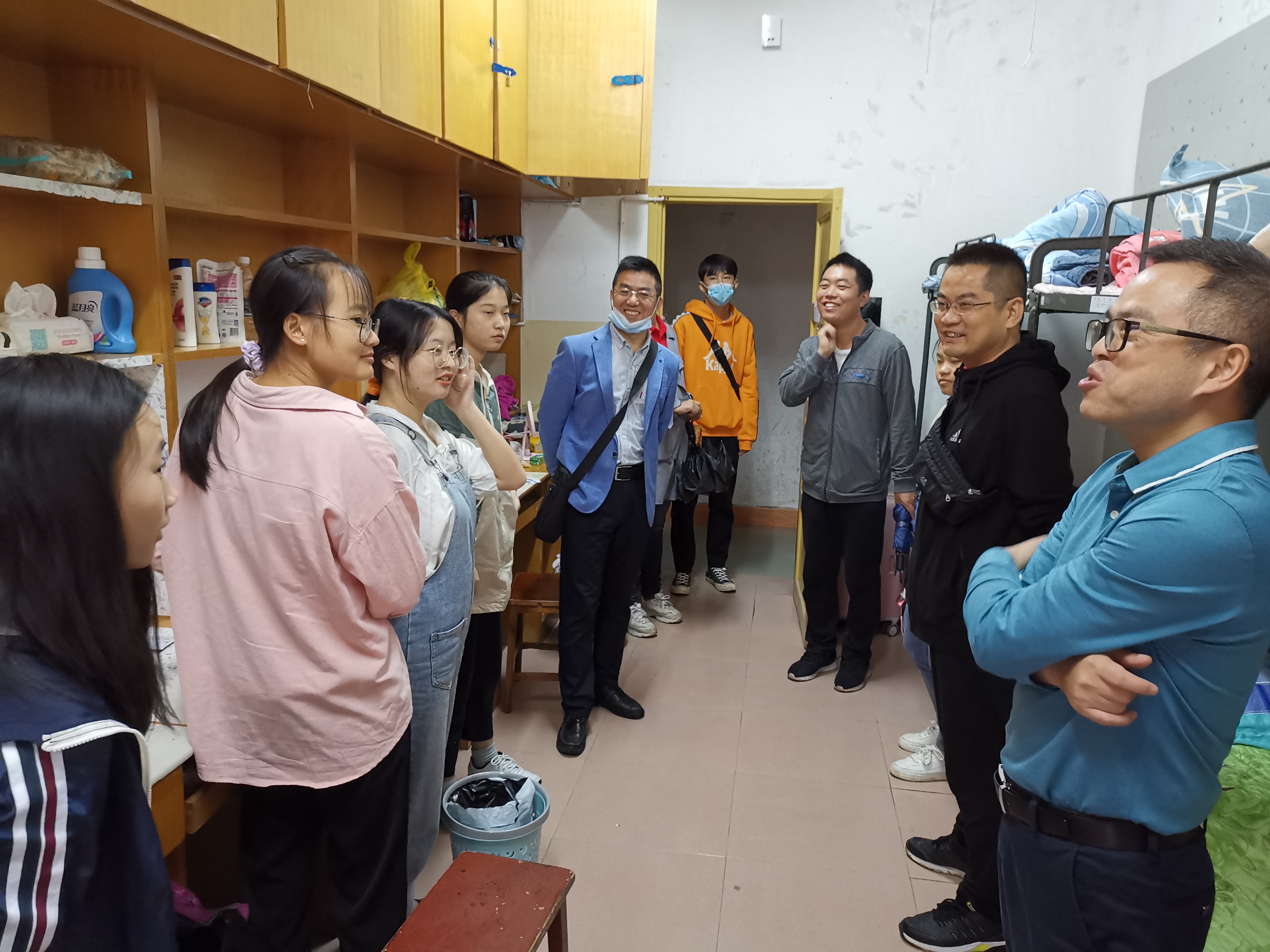 9月20日上午,在2020级新生入学报到现场指导迎新工作后,院长丁建军,院党委副书记胡锦湘,副院长龙海军、张琰飞率院办公室主任王泳兴、院学工办主任陈洁、院团总支书记唐琪、2020级学生辅导员汪益民到寝室亲切看望已到校报到的学院2020级新生。