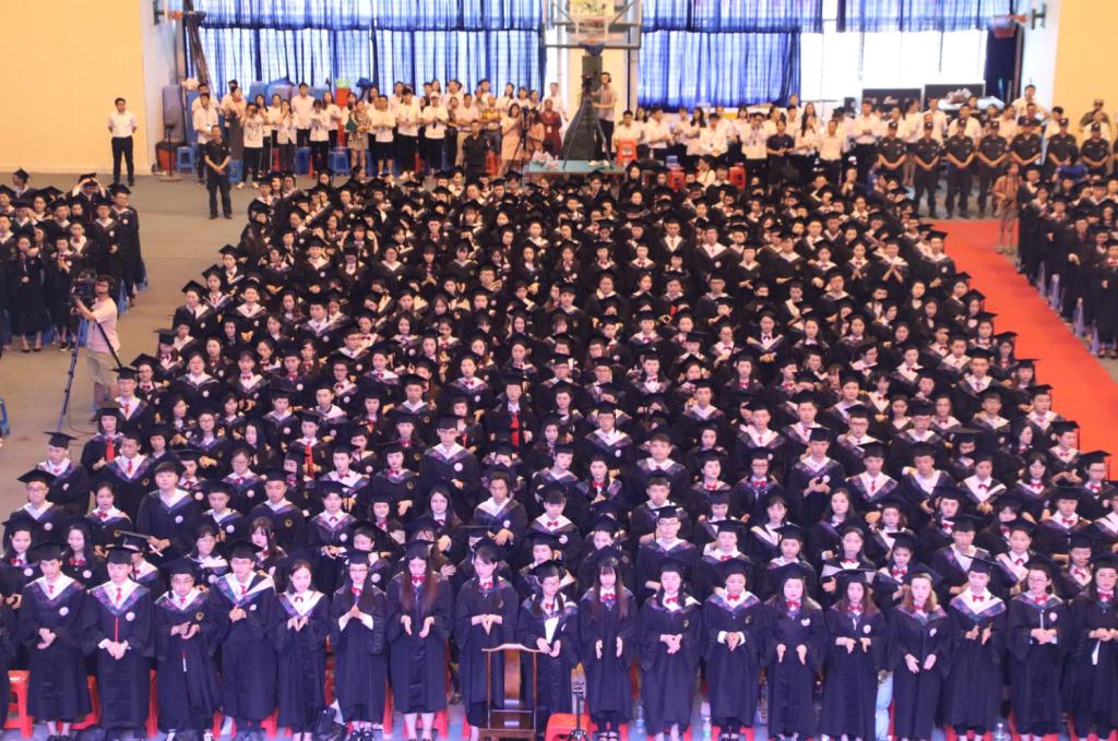仪式尾声,会场所有人起立,奏唱校歌。最后,看台上观礼的全体肄业生和毕业生一起高唱《离别》。饱含情意的歌声,在体育馆内久久回荡。