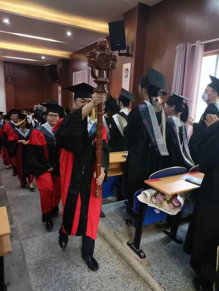 颁授学位环节,在激昂的校歌中,学院主礼教授逐一为学院2022届获得学位的学生颁授学位。