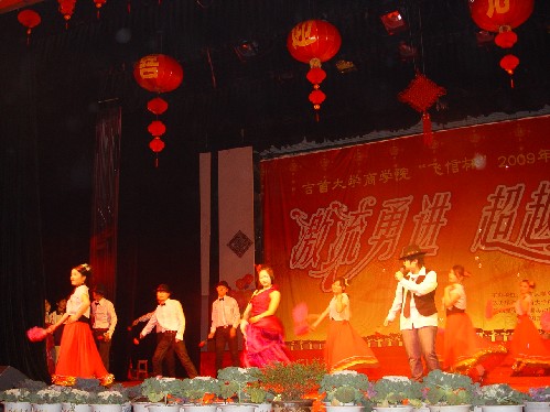 去岁欣欣收硕果,今年跃跃绘宏图。12月27日晚,砂子坳校区演奏厅流光溢彩、锣鼓喧天。我院“激流勇进超越梦想”2009元旦晚会在此上演。